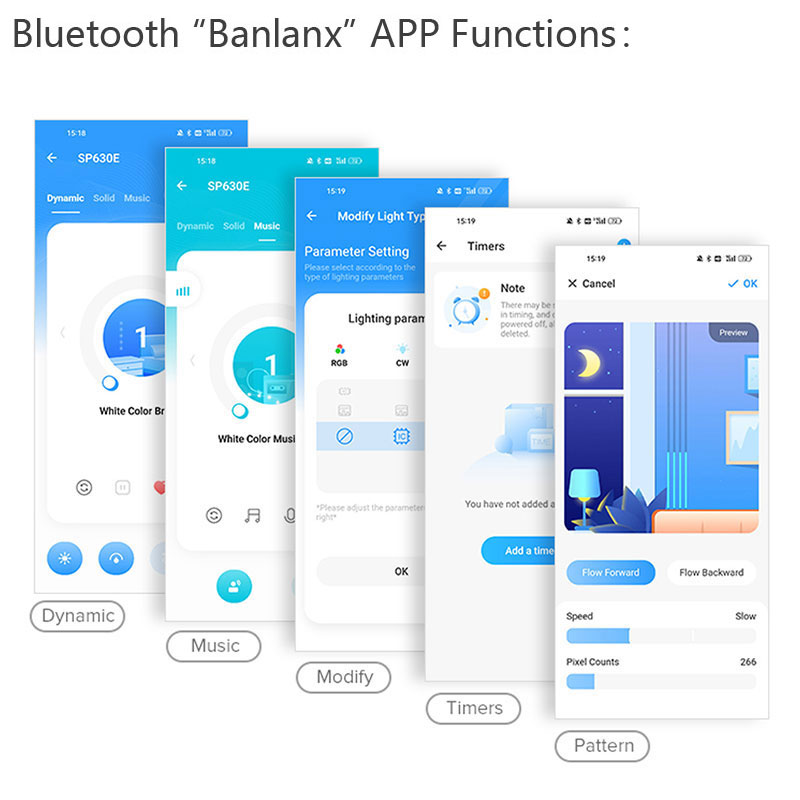 - Způsoby ovládání: Smartfon aplikace (Bluetooth), RF dotykový panel (RC1), Hudební senzor (vestavěný mikrofon)