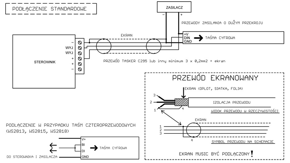 - Doporučená délka řídicího kabelu LED pásky: Max. 10 cm (delší vyžaduje stíněný kabel).