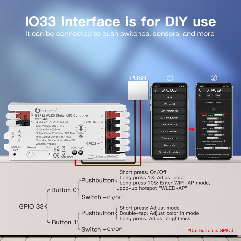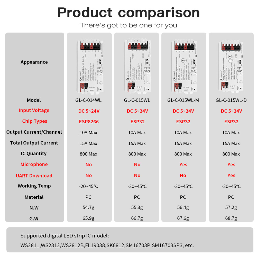 GLEDOPTO GL-C-015WL-M – WiFi ESP32 Mini 5v1 ovladač pro Digitální Pixel LED pásky, 5-24V, 15A, 800 pixelů, MIC
