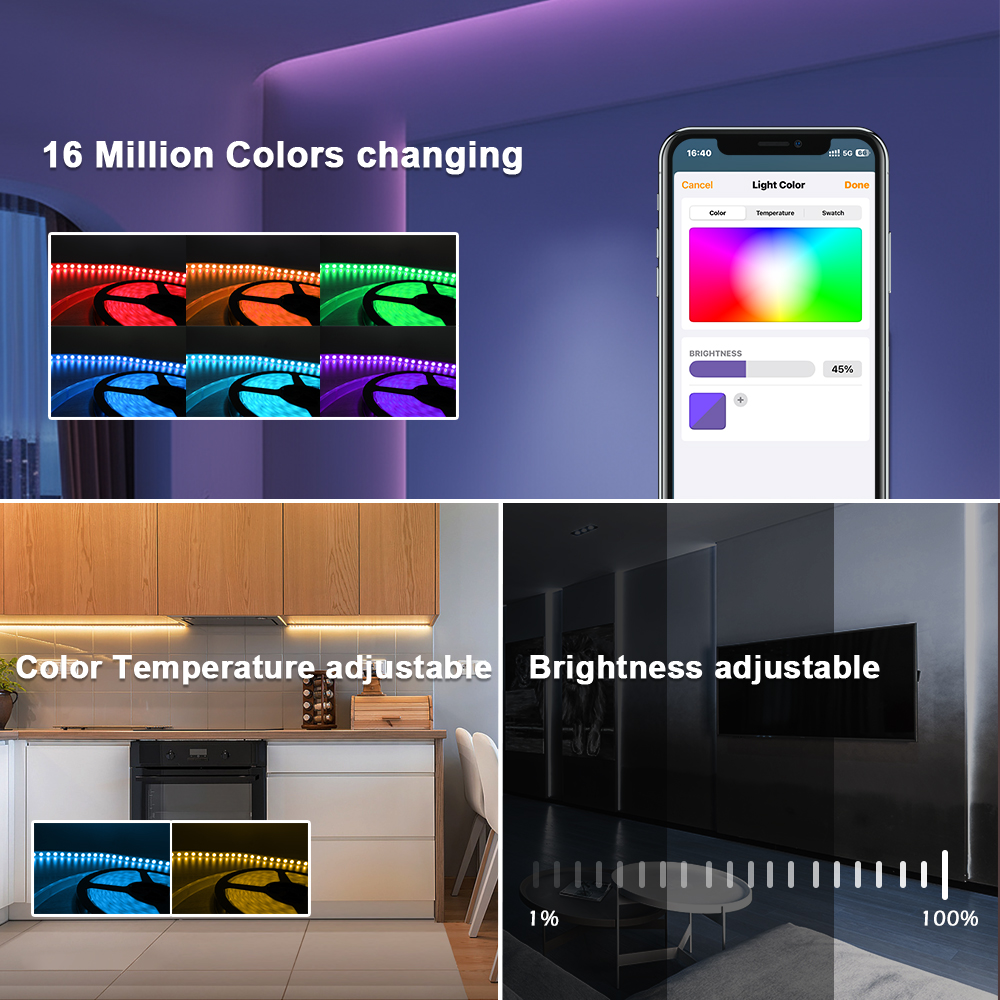 - Plná kontrola osvětlení (RGBCCT): Ovladač je kompatibilní s RGBCCT (RGB+Color Temperature) LED pásky, což znamená, že můžete ovládat nejen miliony barevných odstínů, ale také měnit teplotu bílé barvy (od teplé po studenou bílou) a samozřejmě plynule stmívat.