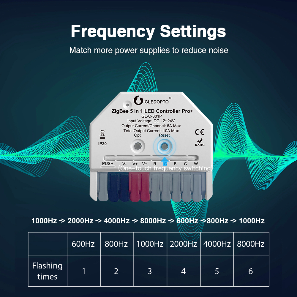 - Nastavitelná PWM frekvence: GL-C-301P umožňuje měnit frekvenci v rozsahu 600Hz až 8000Hz (výchozí je 1000Hz). Tato funkce je užitečná pro eliminaci blikání při natáčení kamerou nebo pro optimální kompatibilitu s různými napájecími zdroji.