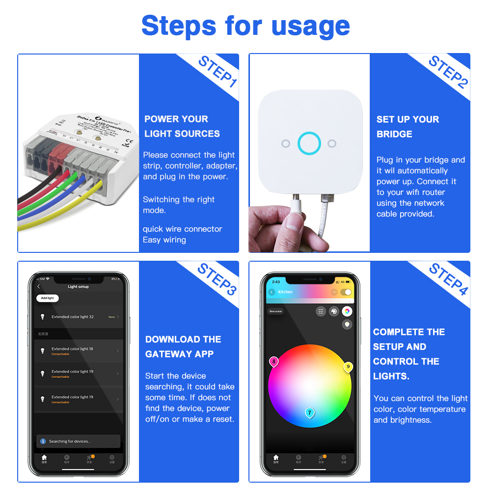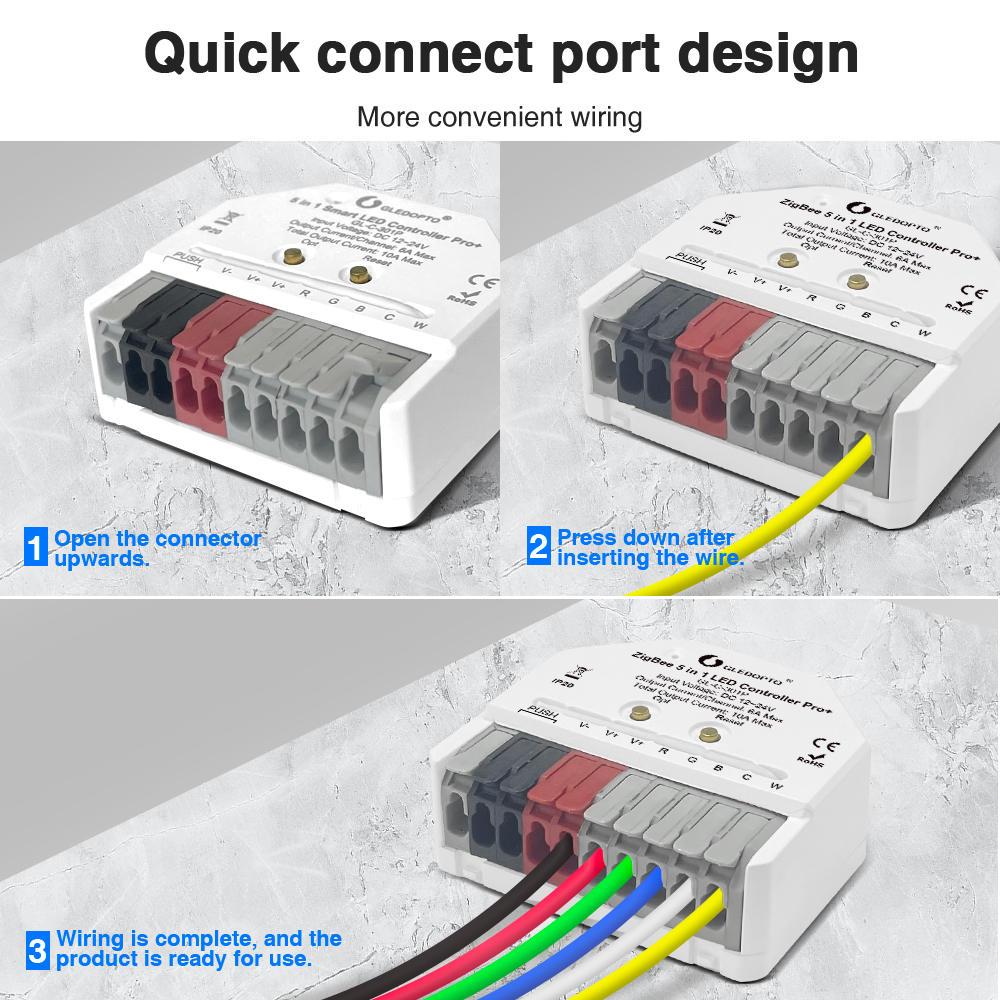 Špičková konektivita a chytrá integrace: Ovladač pracuje s protokolem ZigBee 3.0, což zaručuje plynulou a spolehlivou komunikaci s vaší chytrou domácností. Snadno se spáruje s oblíbenými ZigBee bránami jako Philips Hue, Amazon Echo Plus a SmartThings, což vám umožní ovládat osvětlení hlasem, přes mobilní aplikaci nebo automatizacemi. Kromě ZigBee podporuje i 2.4G RF dálkové ovladače Gledopto, které nabízejí až 110 dynamických režimů, plné barevné kolo, ovládání jasu, sytosti a teploty bílé, a také paměť scén.