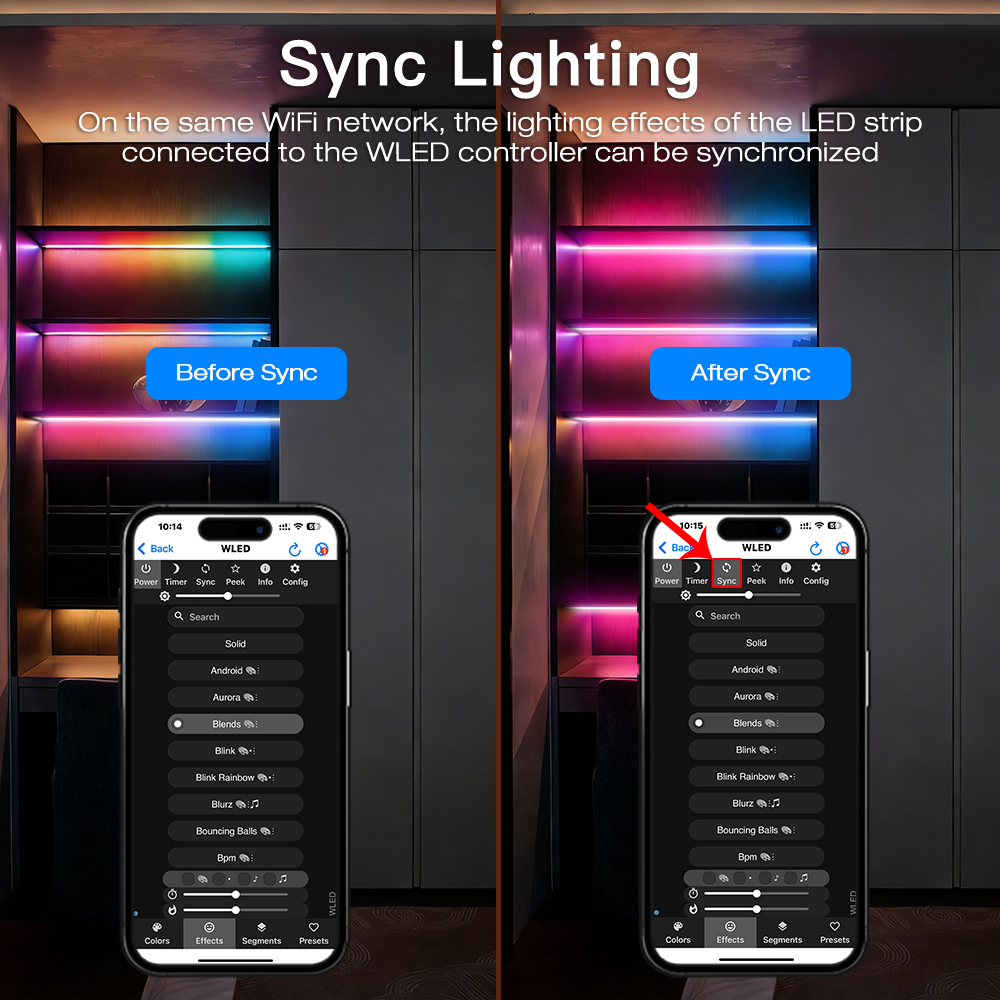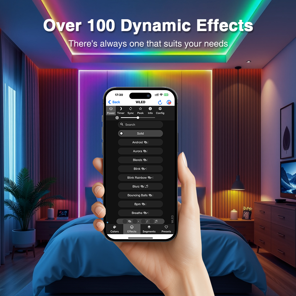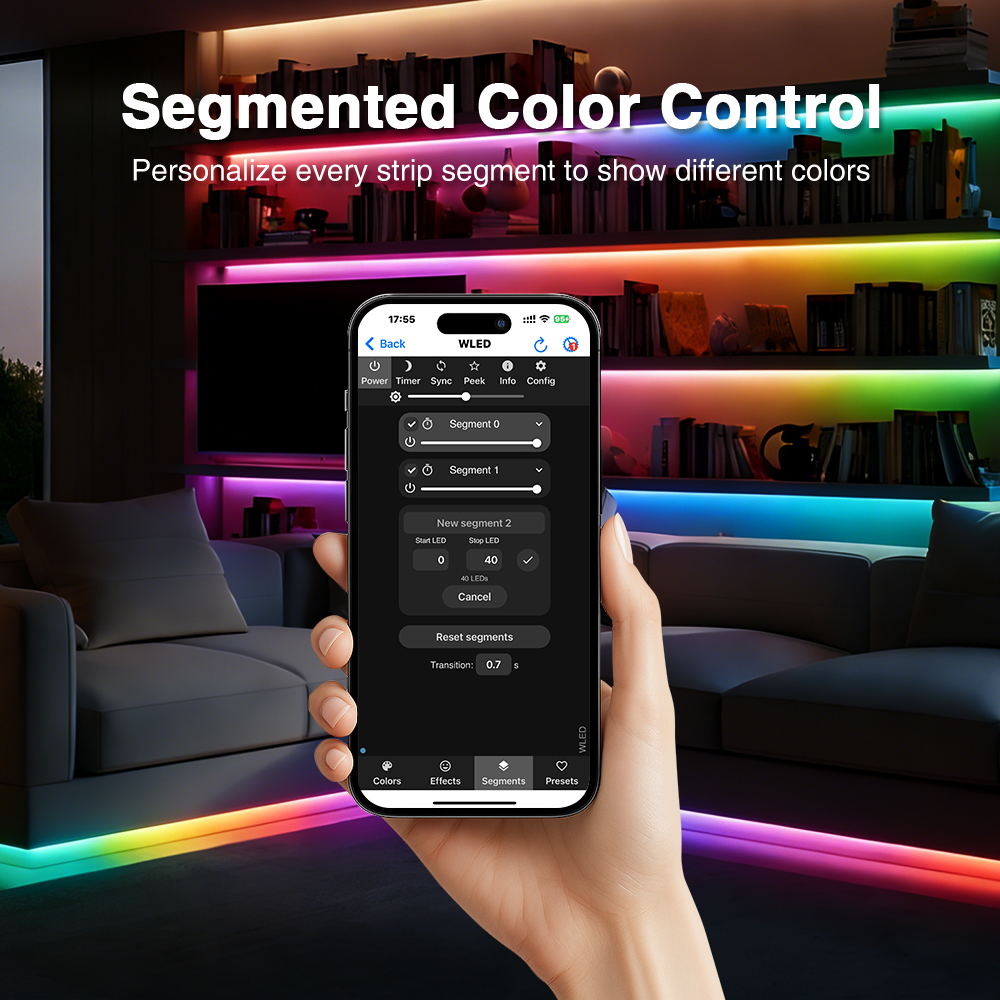 - Segmentované ovládání: Možnost rozdělit LED pásek na více segmentů a ovládat je nezávisle s různými efekty.