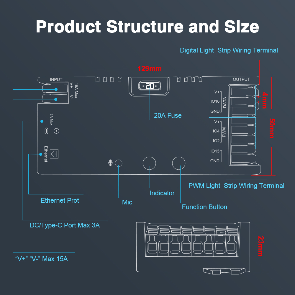 - Type-C port: Slouží pro napájení (5V/3A Max) nebo pro snadnou konfiguraci/debugování.