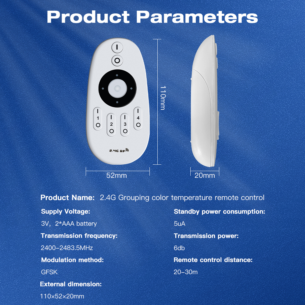 - Pokročilá 2.4G RF Bezdrátová Technologie: Ovladač využívá vysoce frekvenční bezdrátovou přenosovou technologii 2.4G, která zajišťuje silnou odolnost proti rušení, vysokou rychlost komunikace a dosah 20-30 metrů. Díky nízké spotřebě energie (standby 5uA) na dvě AAA baterie vydrží ovladač dlouho v provozu.