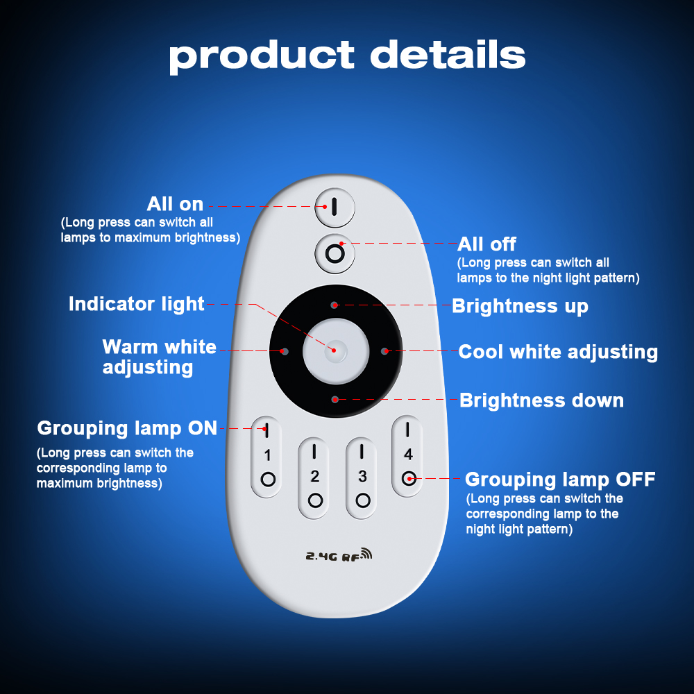 - Noční režim: Jediným dlouhým stiskem tlačítka "Master Off" nebo "Group Off" se světlo ztlumí na 1% jasu pro příjemné noční osvětlení.