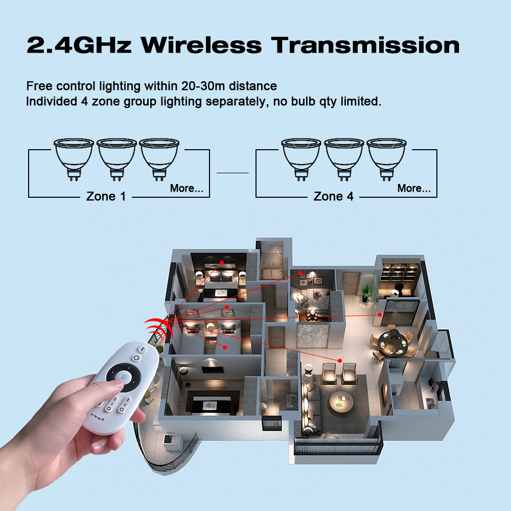 - Čtyři Nezávislé Zóny (Group Control): S Gledopto GL-RC-002 můžete rozdělit svá světla až do čtyř oddělených zón, které lze ovládat individuálně nebo všechny najednou. Každá skupina může obsahovat neomezený počet spárovaných svítidel, což vám dává bezkonkurenční flexibilitu při vytváření světelných scén.