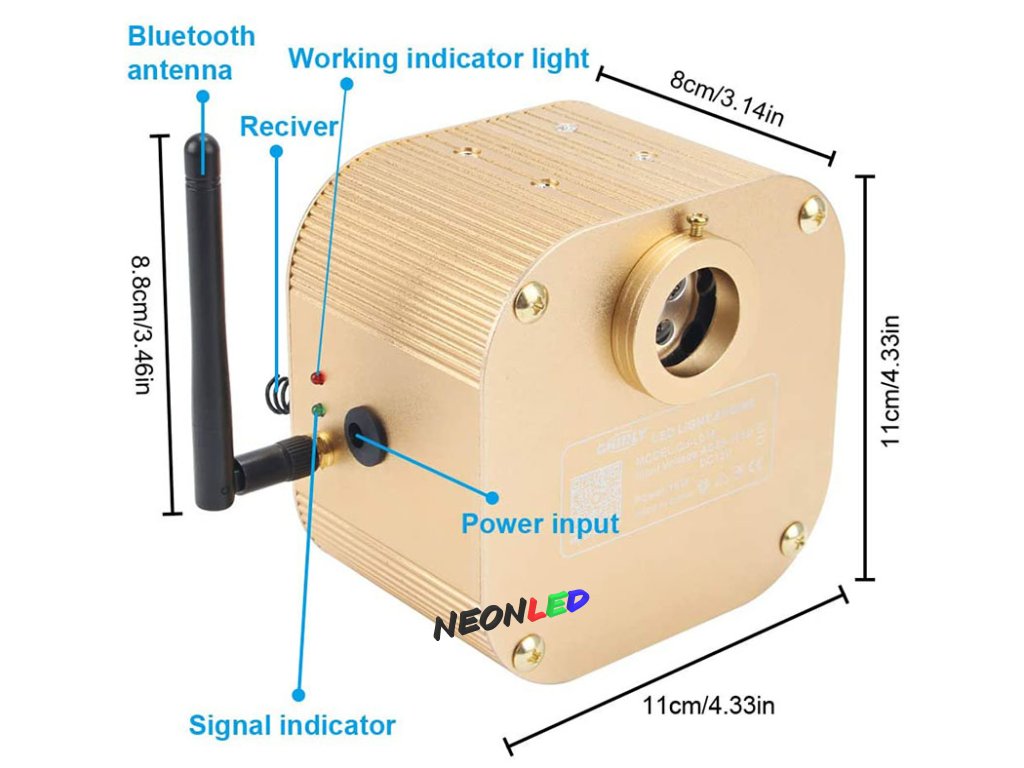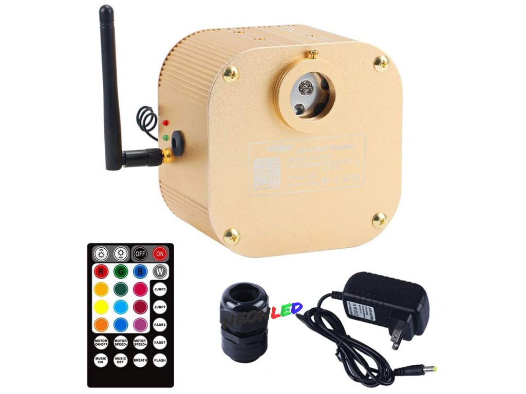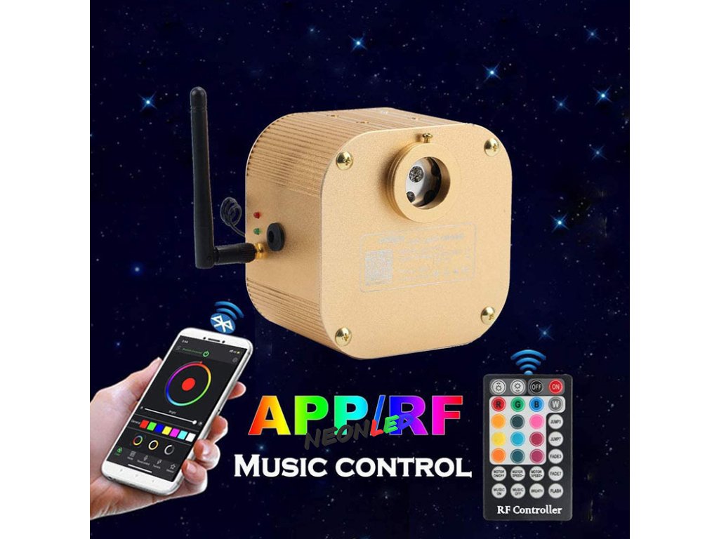 Tento světelný zdroj s funkcí třpytu a RGBW LED pro optická vlákna je kompatibilní s ovládáním přes Bluetooth a RF dotykovým dálkovým ovládáním. Můžete jej připojit k autu nebo jen zapojit do zásuvky. Průměr hlavy spojky je 20 mm.