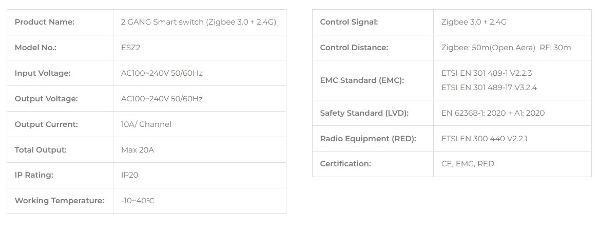 - Typ zařízení: 2-kanálový (2-gang) chytrý spínač