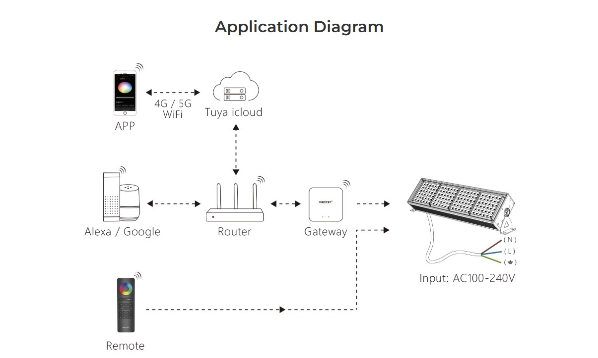 - Široké možnosti ovládání: Světlo lze ovládat pomocí RF dálkových ovladačů (2.4GHz), panelových ovladačů nebo přes smartphone a hlasové asistenty (Alexa, Google Assistant) při použití příslušné brány (brána WL-Box1).