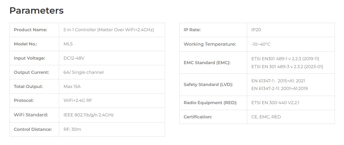 - Robustní výkon: S podporou napětí od 12V až do 48V a maximálním výstupním proudem 20A si ML5 poradí i s dlouhými a hustými LED pásky bez ztráty výkonu.