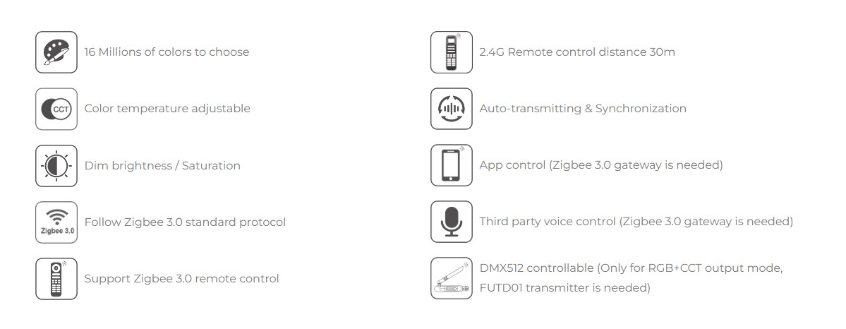 - DMX512 ovladatelné: Pro režim RGB+CCT je možné ovladač integrovat do DMX512 systémů s použitím volitelného DMX512 LED transmitteru (FUTD01).