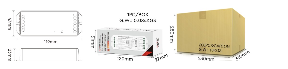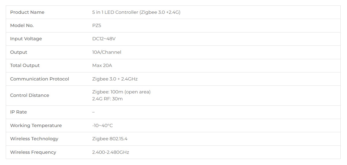 MiBoxer PZ5 je inovativní 5-in-1 LED ovladač, který přináší revoluci do ovládání vašeho osvětlení. Díky integrovaným technologiím Zigbee 3.0 a 2.4G RF nabízí bezkonkurenční flexibilitu a širokou škálu možností. Tento ovladač je schopen pracovat s jednobarevnými, CCT (Dual White), RGB, RGBW a RGB+CCT LED pásky, což z něj činí ideální volbu pro jakýkoli typ světelné instalace. S maximálním výstupním proudem 20A (což odpovídá 240W při 12V nebo 480W při 24V) dokáže efektivně napájet i delší úseky LED pásků.