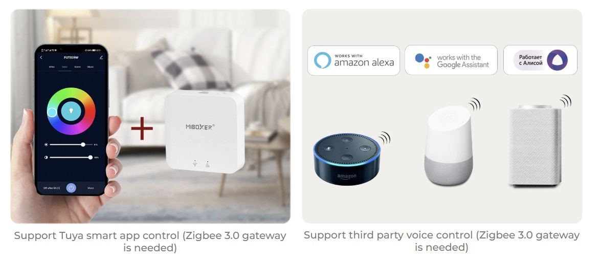 - Hlasové ovládání: Po připojení k Zigbee 3.0 bráně nebo kompatibilnímu zařízení Amazon Echo Plus (2. generace), Echo (4. generace), Echo Studio nebo Echo Show (2. generace) můžete osvětlení ovládat hlasem přes Amazon Alexa a Google Home.