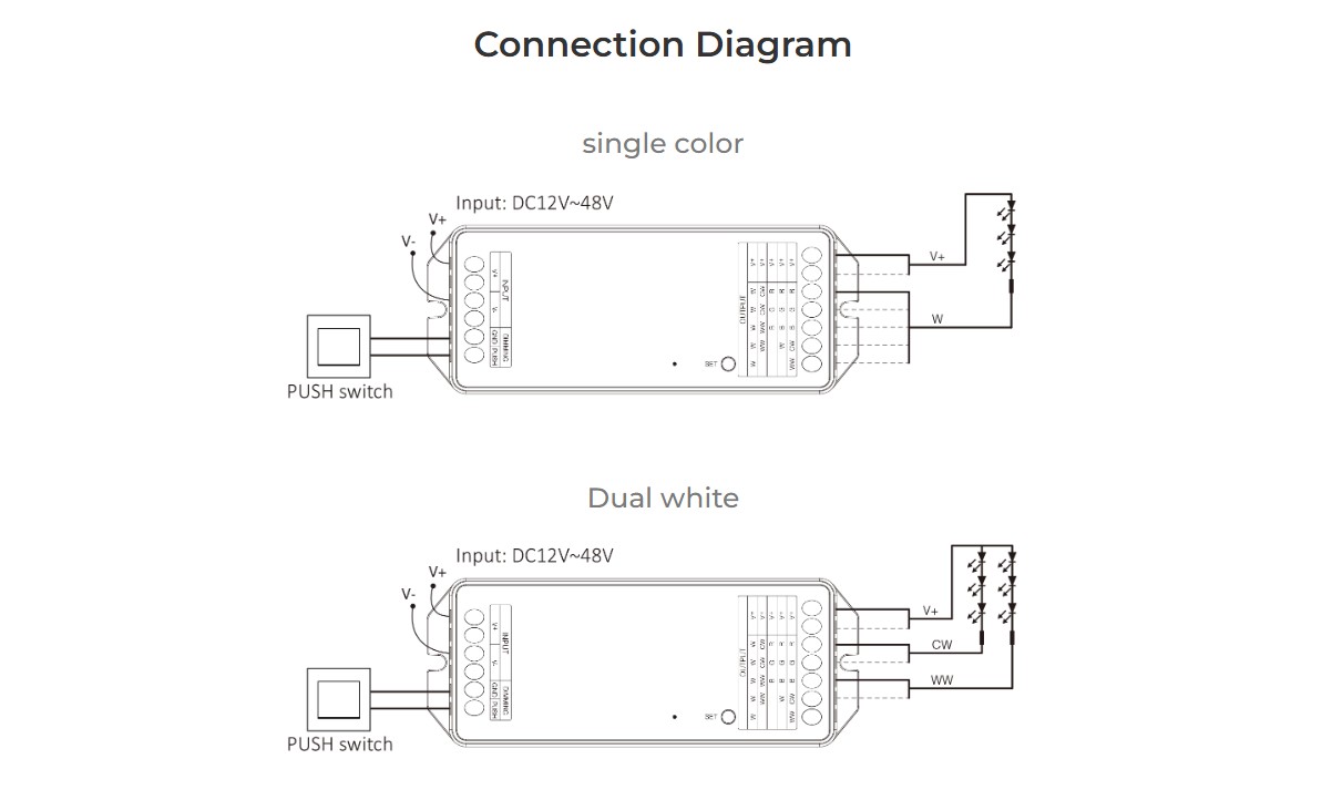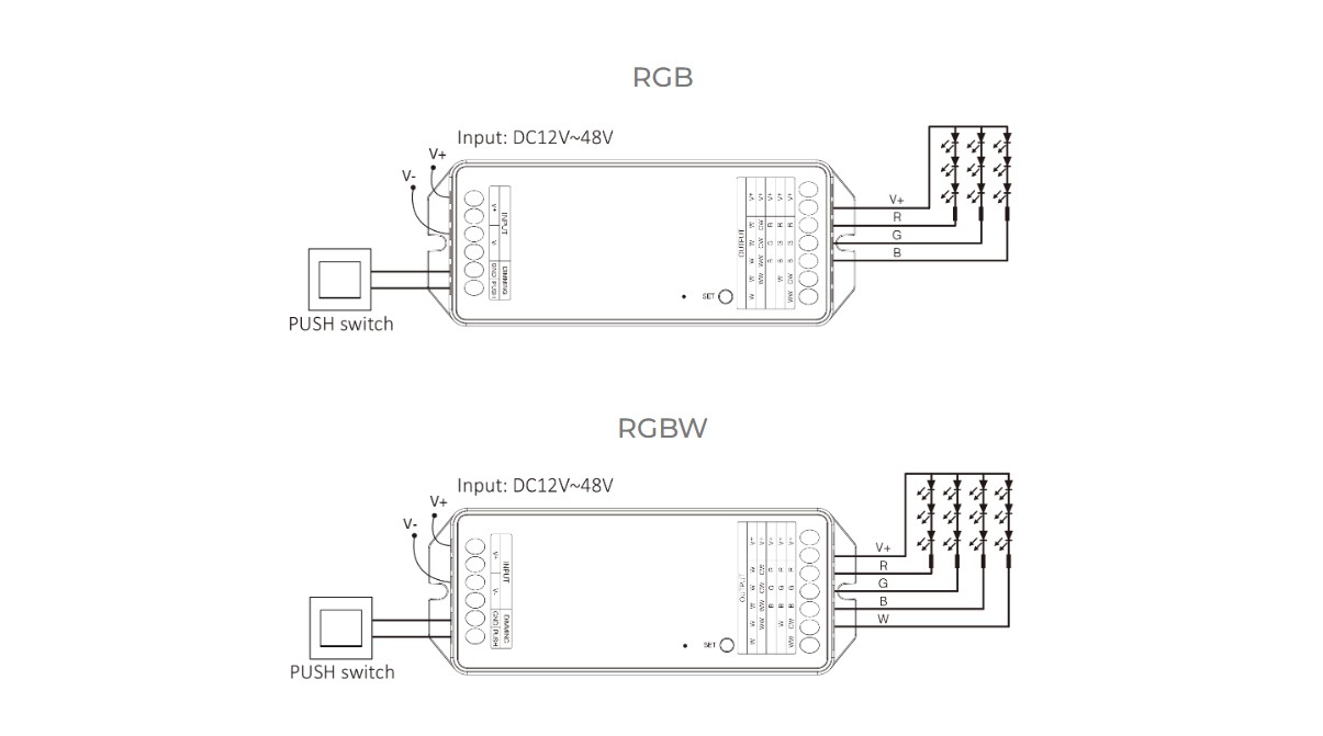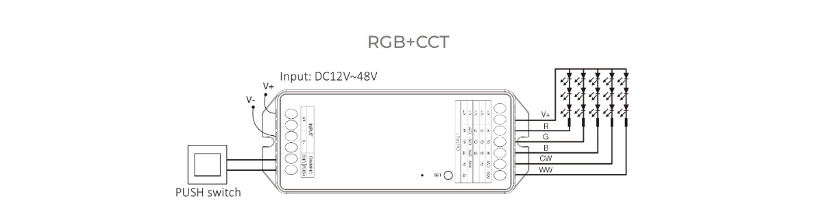 - 5 režimů v 1 ovladači: Jednoduchým přepnutím tlačítka "SET" můžete vybrat správný výstupní režim pro vaše LED pásky: Single Color (bílá), Dual White (žlutá), RGB (červená), RGBW (zelená), RGB+CCT (modrá).