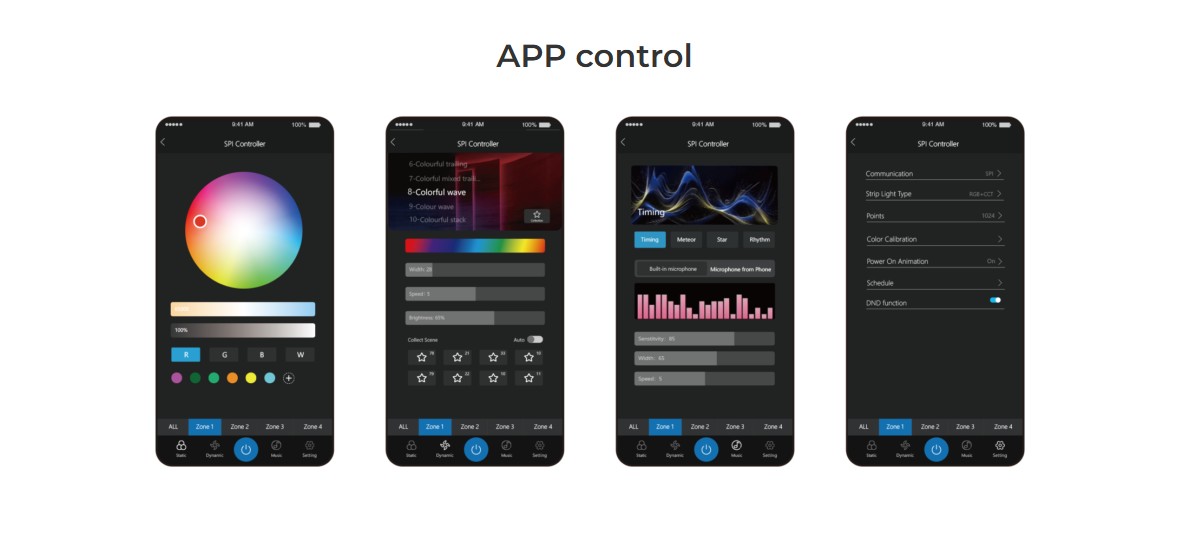 - SPI Pixel Master: Popusťte uzdu kreativitě! Připojte digitální LED pásek (WS2811, WS2812B, SK6812, TM1812 a další) a ovládejte až 1024 jednotlivých pixelů. Vytvářejte dechberoucí animace, barevné přechody a efekty, které oživí každý prostor. Aplikace je nabitá desítkami přednastavených dynamických scén!