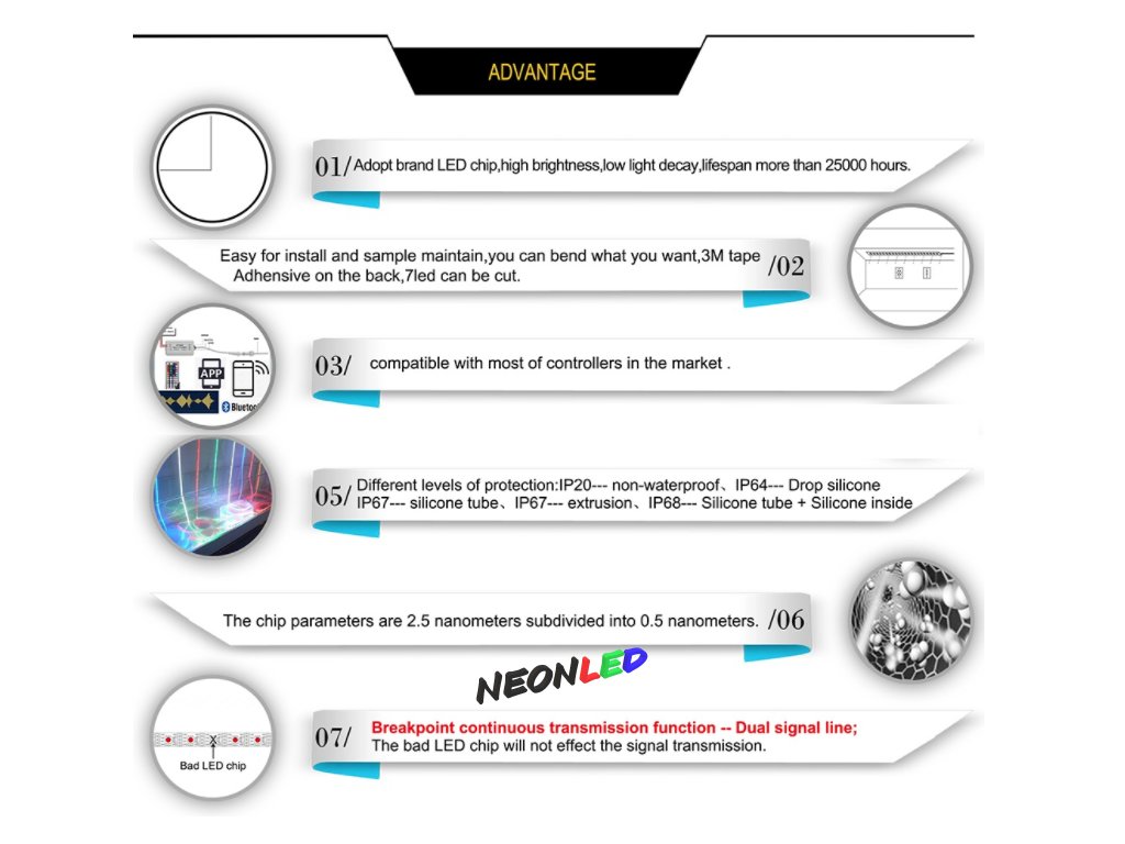 LED pás se skládá ze 30 diod na metr typu SMD5050 značky Epistar, což představuje spolehlivou a cenově výhodnou variantu LED pásů. Díky jednoduché instalaci, nízké spotřebě a standardní světelné intenzitě je pásek využíván především k dekoračnímu osvětlení.